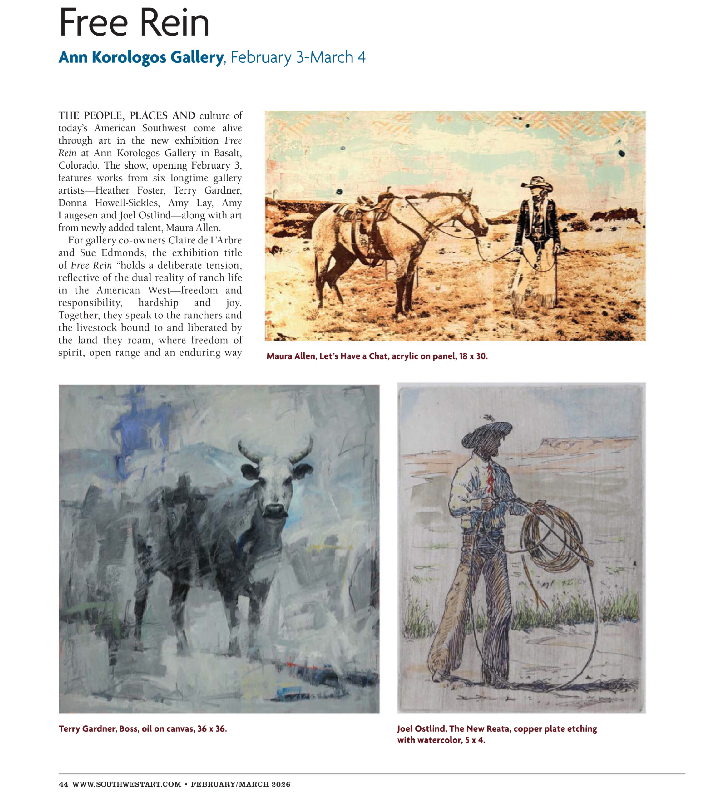 Featured in Southwest Art magazine, Free Rein brings together works by six longtime gallery artists — Heather Foster, Terry Gardner, Donna Howell-Sickles, Amy Lay, Amy Laugesen and Joel Ostlind — alongside new talent Maura Allen. Each artist explores themes of freedom, responsibility, rugged terrain, and the lived experience of ranch life through painting, sculpture, mixed media, and printmaking. The exhibition’s title reflects […]