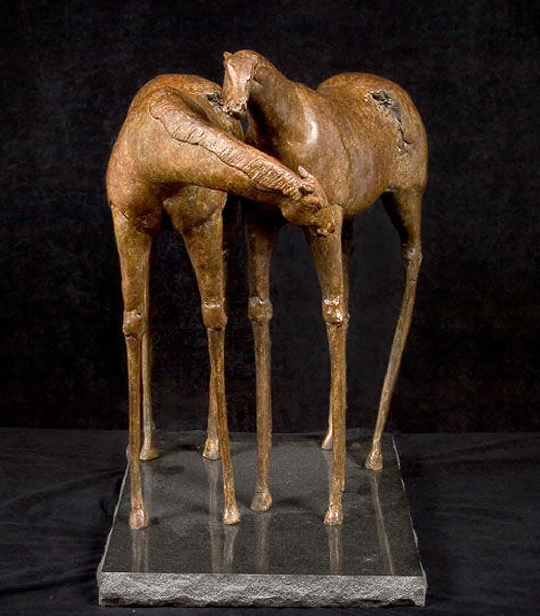 By contrast, Immi Storrs cares very little about the details. Rather, she lets her hands guide her instead of her head. The result: horses of pure imagination. Sometimes her bronzes have more than one head, sometimes they are missing legs. While Immi’s horses are still recognizable, they take on “other world” qualities, suggesting fantasy and dreams.