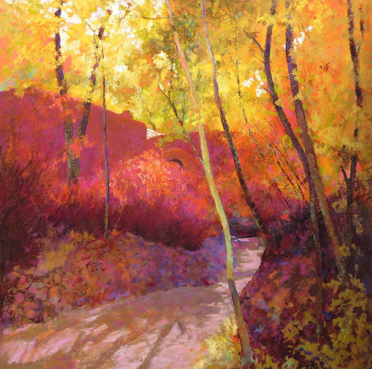 Before she began her career as a fine artist, Elizabeth Sandia had a background in advertising, illustration, and architecture. When she moved to Santa Fe specifically to become a fine artist 21 years ago, she studied with a famous pastel artist who advocated working plein air. Her 6th painting won her several awards and showed her that she was on the right track. She only painted plein air and drove many places at the time to find great subjects — Colorado, Arizona, Wyoming, California.