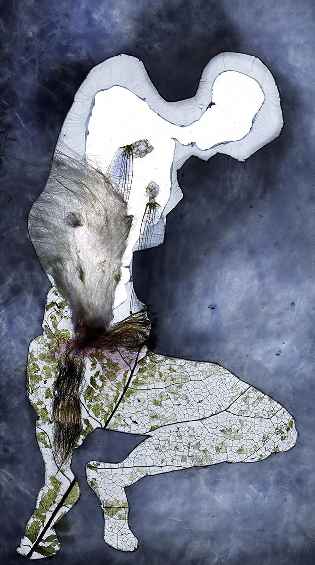 Being alive is hard to express through any medium, and so I look to the bodies and textures of former living forms to connect the viewer conceptually to primal forces, psychological states, and deep-seated, archetypal trials. Leaves, insects, seeds, fur, the bodies of dead reptiles and amphibians, and other natural detritus are collaged and manipulated to illustrate clear moments of struggle. The leaf is used as the symbol of human individuality within the collective whole. Housed inside individual human figures, recognizable living forms are juxtaposed to signify voices in contest. The animal forms represent the choices themselves: one choice will consume the other in this battle— to eat or be eaten, an epic struggle playing out.